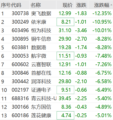 个股方面,奥飞数据跌近13%,依米康跌近11%,恒为科技封住跌停板,数据港、铜牛信息等跟跌。