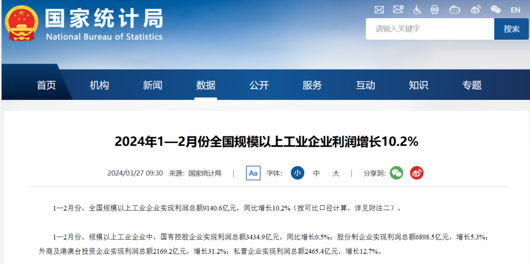 3月27日上午,国家统计局最新发布数据显示,1至2月份,全国规模以上工业企业实现利润总额9140.6亿元,同比增长10.2%。