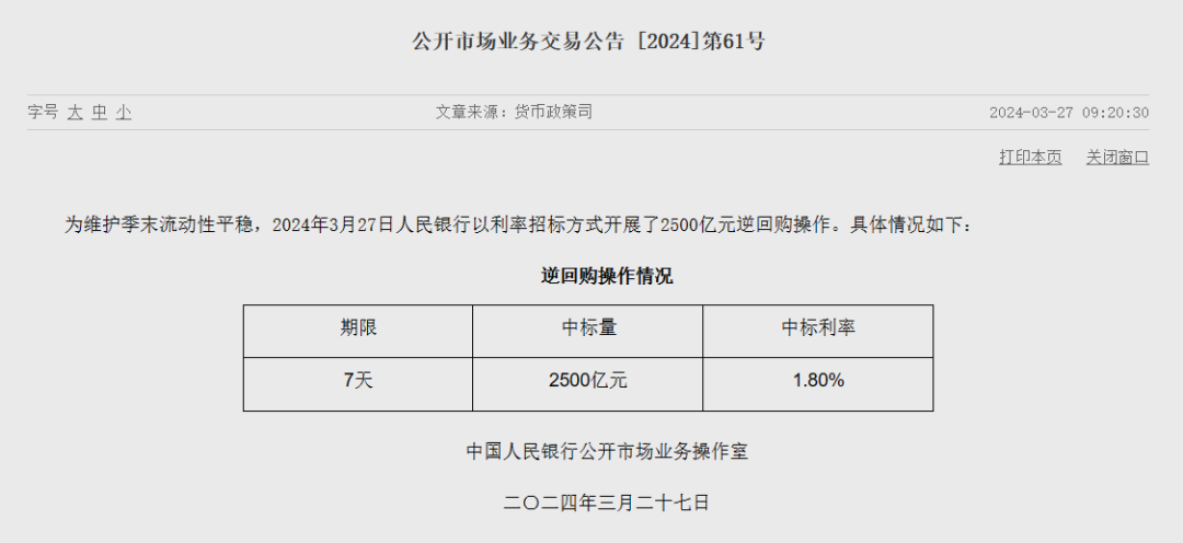 首先来看央行动作:为维护季末流动性平稳,2024年3月27日人民银行以利率招标方式开展了2500亿元逆回购操作,中标利率为1.8%。Wind数据显示,当日30亿元逆回购到期,因此净投放金额为2470亿元。