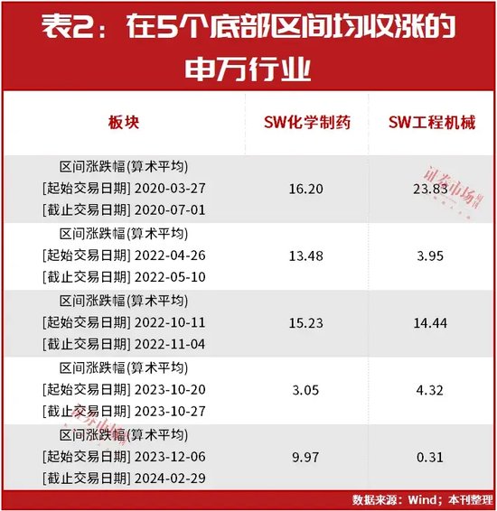 如统计近4年的数据显示,沪指也曾多次跌破3000点,其中2020年3月27日至2020年7月1日等5次延续时间较长,而在这5个底部区间,A股市场各个行业的表现也是参差不齐,但申万化学制药和工程机械两个行业始终表现不俗,在5个底部区间均录得上涨(见表2)。