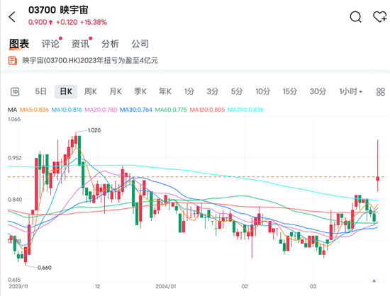 映宇宙因业绩增长,今日开盘大幅上涨,涨幅一度超过28%,股价达到1港元,为四个月以来的最高价。截至收盘,股价报0.9港元,涨幅为15%。