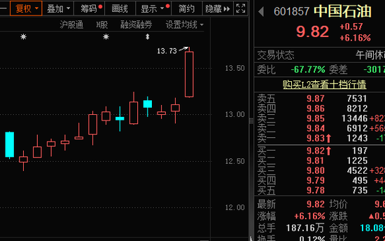 早盘,中国石油股价续创2016年以来新高,盘中最高上涨6.7%,收盘涨6.16%。早盘石油石化板块整体走高,中海油服、康普顿涨停,“三桶油”集体大涨,中国海油、中国石化分别上涨3.52%、2.89%。