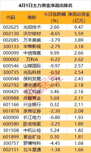 数据宝统计,4股主力资金净流出超3亿元。光启技术净流出9.47亿元,居首位,该股连续5个交易日上涨,期间累计涨幅31.93%。