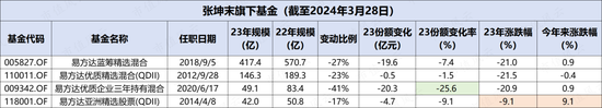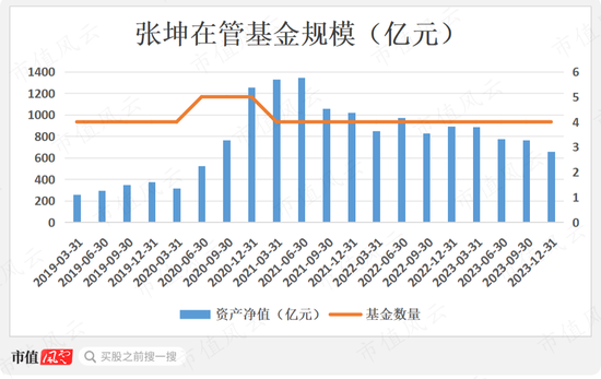 张坤目前管理四只基金(A/C份额合并计算),截止去年底合计规模654.7亿,较2021年的巅峰期已缩水一半。