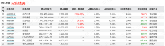 以蓝筹精选持仓为例,山西汾酒在中报只有28万股,年底直接干到750万股,增幅达25倍;药明康德未出现在中报中,但年底持仓市值急速飙至16亿。