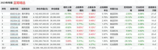 以规模最大的易方达蓝筹精选为例,前五大重仓股仍为贵州茅台、五粮液、洋河股份、泸州老窖以及腾讯控股,且占基金净值比均在9%以上。