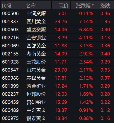 黄金股集体高开,中润资源(维权)、莱绅通灵涨停,盛达资源、四川黄金涨幅超5%。