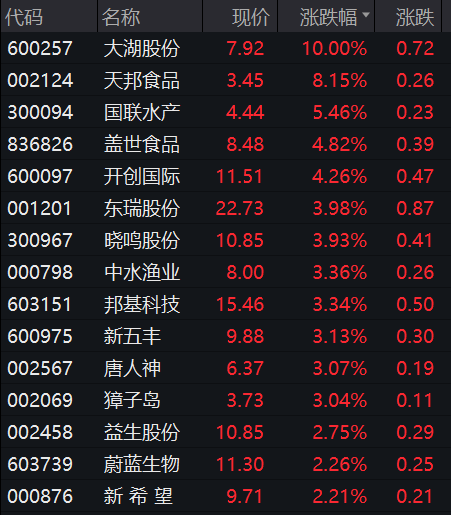 农业板块震荡走高,猪肉股涨幅居前,大湖股份涨停,天邦食品、国联水产、盖世食品等涨幅居前。