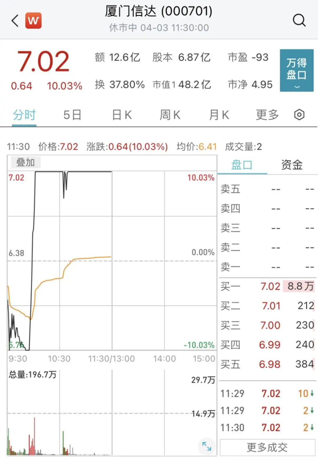 厦门信达盘中上演“地天板”,成交额为12.6亿元,当前厦门信达股价报7.02元/股,总市值为48.2亿元。