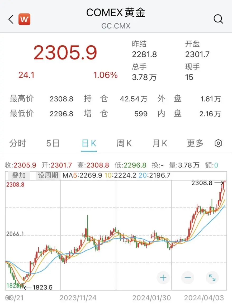 消息面上,受地缘政治冲突等因素影响,国际金价突破2300美元/盎司,再创历史新高。