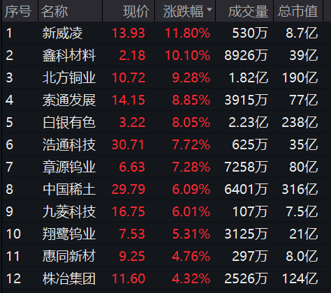 此外,基本金属、稀有金属板块盘中快速冲高,鑫科材料涨停,北方铜业、索通发展、白银有色等跟涨。