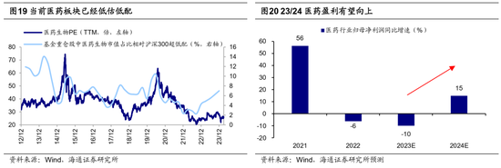 低估低配、基本面向好的医药性价比凸显。当前医药板块的估值仍处于历史较低水平。从估值看,当前医药PE(TTM)为25.9倍,处13年以来12.3%分位。往后看,中长期医药行业供需格局向好,配置性价比已经凸显。供给侧方面,医药改革正不断深化,医疗反腐将推动行业形成有序竞争的格局,进而扭转医药行业重销售、轻研发的现状,22年医药板块销售费用占营收比重达14%,但研发支出占比仅为5%,未来药企有望加大创新研发投入,行业集中度有望向具备优质产品的药企集中。需求侧方面,人口老龄化背景下医疗需求或将增加。21年底中国60岁及以上人口占总人口比例为18.1%。根据联合国人口署预测,当前我国老龄人口数量正处于S型的陡峭上升期,到2050年该占比或超30%。随着人口老龄化程度深化,未来居民医疗需求将不断增加。此外,横向对比其他国家看,我国医疗支出占GDP比重仍有提升空间,20年我国医疗支出费用占GDP比重仅为5.7%,而美、英、日等发达国家均在10%-20%之间。结合海通行业分析师预测,24年医药生物板块归母净利增速有望达到15%,细分子领域中可以关注创新释放新需求的创新药、以及受益于院内刚需和老龄化需求的医疗器械,预计创新药/高值耗材24年归母净利有望达到30%/15%。