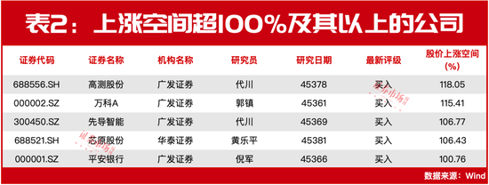 近期,黄金股那么猛,此时购入大家或许有高位抬轿的担忧。而在黄金股之外,也是在近1个月内,各大券商联合出炉了其他多只低位个股名单,并且其目标价较最新收盘价的上涨空间更大。其中,券商给出股价上涨空间最大的是高测股份。公司主营切割装备等,产品主要应用于光伏行业硅片制造环节,受益于设备订单大幅增加等,公司去年业绩大增,归母净利润14.61亿元,同比增长85.28%。对此,广发证券认为,公司业绩持续高增,可以耐心等待周期重新启动,并给予公司67.42元/股的目标价。这相对于公司最新收盘价将有118.05%的上涨空间。而自2022年下半年以来,高测股份受光伏产能过剩等因素影响,股价走起了下坡路,至今下跌超50%,区间最深跌幅接近70%。目前股价正处于历史的相对低位。在广发证券给予高测股份较高目标价的同时,公募“顶流”傅鹏博和朱璘联合管理的睿远成长价值在四季度末新进入了公司的前十大流通股股东名单,并位列公司第四大流通股股东。“国家队”全国社保基金420组合则继续稳坐第三大流通股股东。另外,根据券商给出的目标价格测算,股价上涨空间超过100%的公司还有万科A、先导智能、芯原股份和平安银行四家(见表2)。