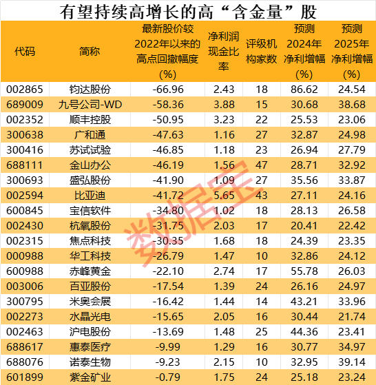 数据宝进一步统计发现,105只净利润含金量相对较高的个股中,有20股均获10家以上机构评级,预计2024年、2025年净利润增速均超20%。其中,钧达股份、九号公司-WD、顺丰控股等8股最新股价较2022年以来最高点回撤幅度超40%。
