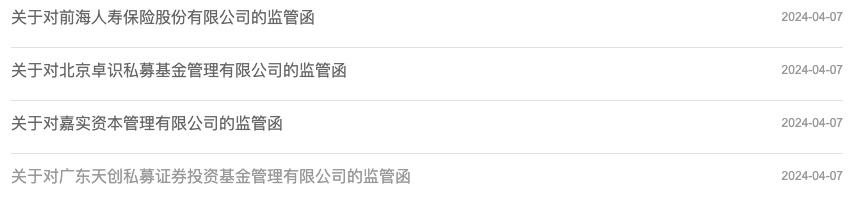 4月7日,深交所发布4份监管函。因在参与深市首次公开发行股票网下询价过程中存在违规行为,广东天创私募证券投资基金管理有限公司(简称“天创私募”)、嘉实资本管理有限公司(简称“嘉实资本”)、北京卓识私募基金管理有限公司(简称“卓识私募”)、前海人寿保险股份有限公司(简称“前海人寿”)等4家新股报价机构采取书面警示措施。
