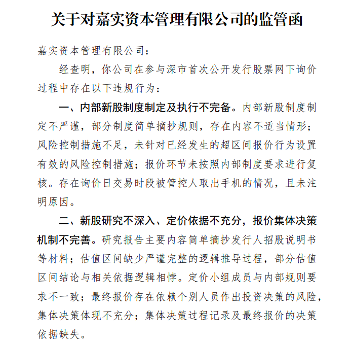 嘉实资本研究报告主要内容简单摘抄发行人招股说明书等材料;估值区间缺少严谨完整的逻辑推导过程,部分估值区间结论与相关依据逻辑相悖。定价小组成员与内部规则要求不一致;最终报价存在依赖个别人员作出投资决策的风险,集体决策体现不充分;集体决策过程记录及最终报价的决策依据缺失。