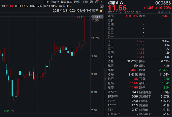 旅游股早间异动,板块指数盘中一度放量直线拉升,最高涨近5%。板块内所有个股飘红,峨眉山A、九华旅游强势涨停,股价均创年内新高,黄山旅游、天目湖、张家界等涨幅居前。