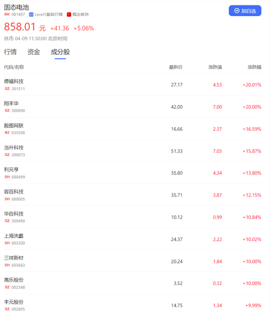 动力电池产业链早间全线走强。其中固态电池概念领涨,板块指数放量飙升逾5%。