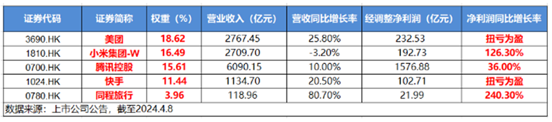 截至4月8日,根据上市公司年报,美团、小米、腾讯、快手、同程旅行盈利同比均实现高增,其营收同比增长率分别达到25.8%、-3.2%、10%、20.5%、80.7%,彰显板块强劲的复苏态势。