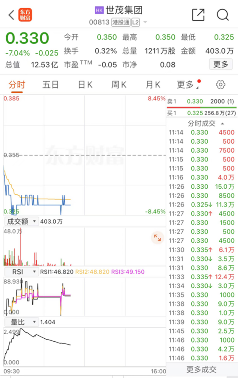 4月8日至4月11日,4个交易日世茂集团累计跌幅逾27%。今日早盘,世茂集团跌超7%,现报0.33港元/股。
