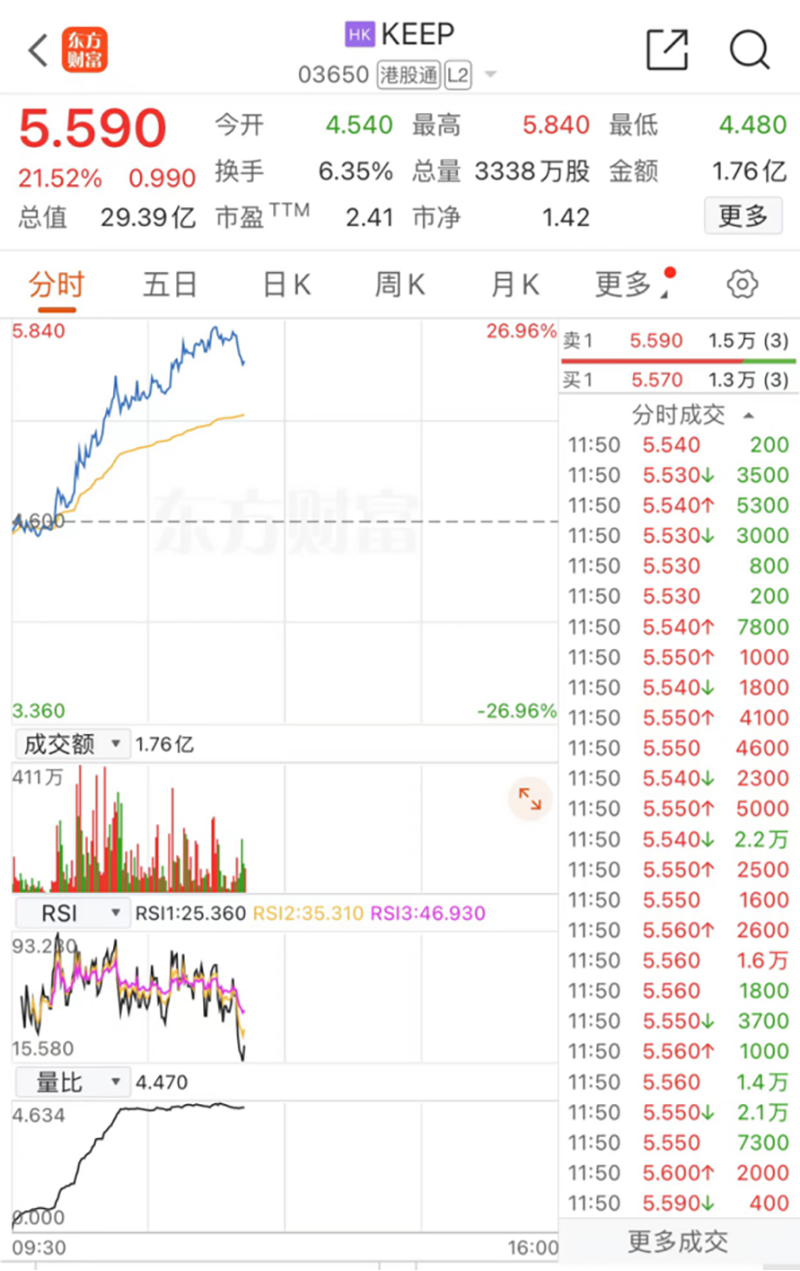 “健身第一股”KEEP港股早盘低开高走,财报业绩发布后累涨近35%。截至发稿,涨21.52%,报5.59港元/股,成交额1.76亿港元。