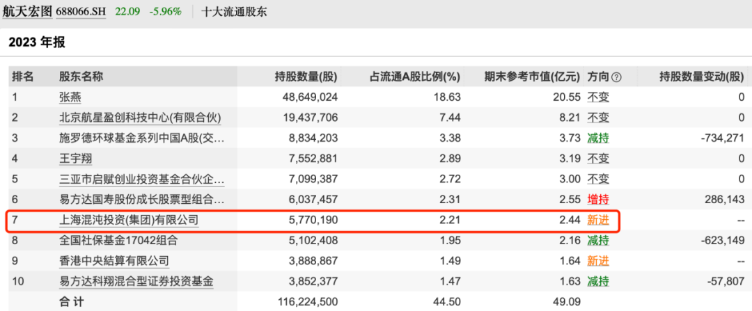 根据最新披露的2023年年报数据,葛卫东掌舵的上海混沌投资(集团)有限公司首次现身遥感卫星应用龙头航天宏图的股东名单,持股增至577.02万股,期末持股市值为2.44亿元,位列第七大流通股东,这是混沌投资近两三年罕见加仓。