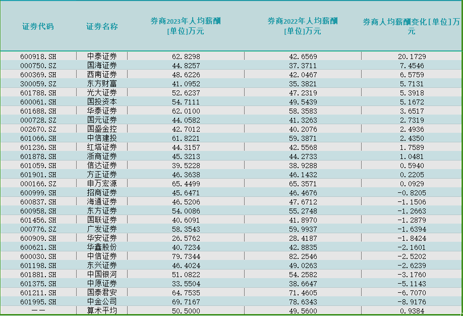 此外,国海证券的人均薪酬也从2022年的37.37万元增加了7.45万元至2023年的44.83万元。