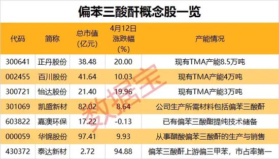 受市场景气影响,偏苯三酸酐概念午后爆拉,泰达新材一度大涨125.6%,收盘涨幅94.88%;华锦股份、嘉澳环保(维权)涨停,正丹股份、百川股份2连板,还有凯盛新材、怡达股份等跟涨。