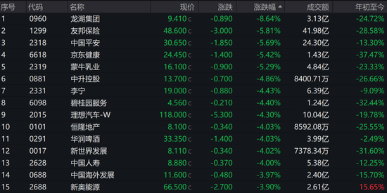 内房、大金融、消费板块领跌。龙湖集团跌8.649%,友邦保险跌5.81%,中国平安跌5.69%,领跌蓝筹。京东健康、蒙牛乳业跌超5%。