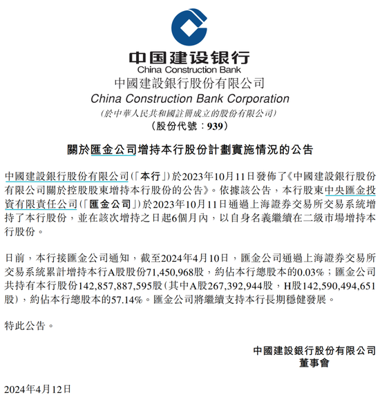 公告表示,日前,建设银行接汇金公司通知,截至2024年4月10日,汇金公司通过上海证券交易所交易系统累计增持该行A股股份7145.10万股,约占建设银行总股本的0.03%;汇金公司共持有建设银行股份142.86亿股(其中A股2673.93万股,H股142.59亿股),约占该行总股本的57.14%。汇金公司将继续支持建设银行长期稳健发展。