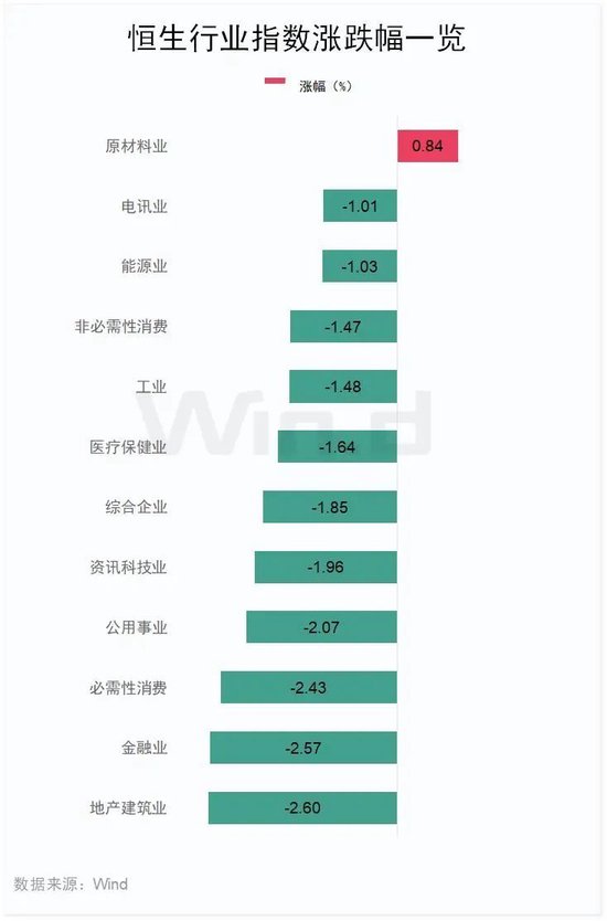 从行业表现看,恒生行业指数日内多数下跌,地产建筑业指数跌2.6%,金融业指数跌2.57%,必需性消费指数跌2.43%。涨幅方面,原材料业指数涨0.84%。