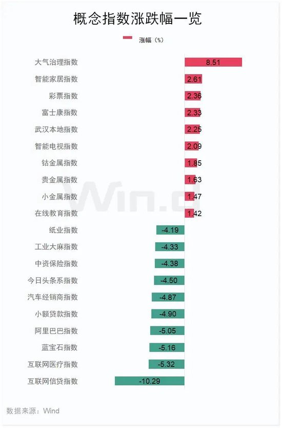 从盘面来看,Wind概念板块多数下跌,互联网信贷指数跌10.29%,互联网医疗指数跌5.32%,蓝宝石指数跌5.16%。涨幅方面,大气治理指数涨8.51%,智能家居指数涨2.61%,彩票指数涨2.36%。
