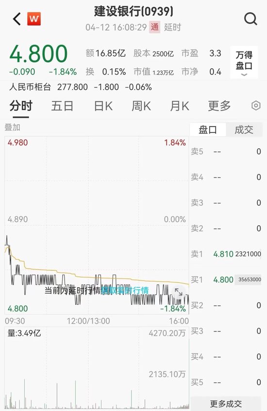 4月12日,建设银行港股跌1.84%,收于4.80港元。