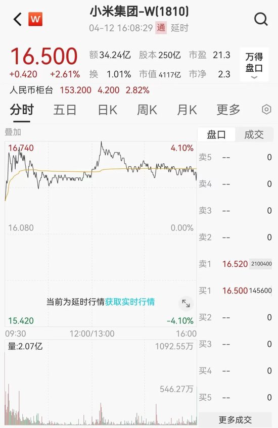4月12日,小米股价逆市大涨,涨幅一度达4.1%。午后涨幅收窄,全天涨2.61%,收于16.50港元。