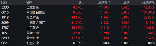 贵金属逆市走强,灵宝黄金涨11.60%,招金矿业涨6.56%,中国黄金国际涨6.03%。