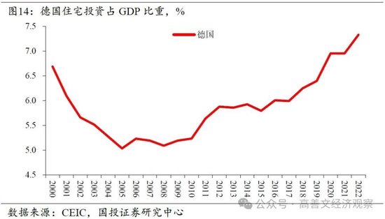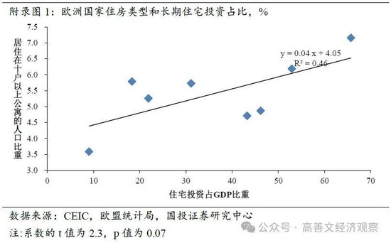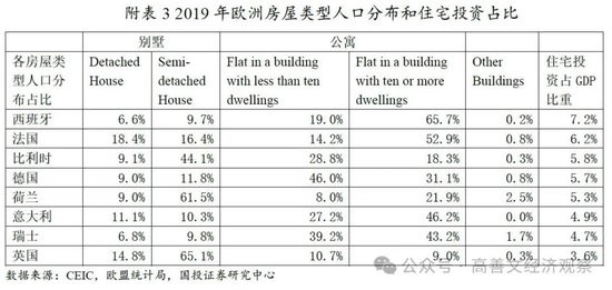不同国家居民的居住类型有较大差异,英美的居民多数居住在别墅(平房),而西班牙和法国则有更多的居民居住在楼房当中。随着建筑层高的增加,建设的材料成本、人工成本都会显著增加。比如美国大多数住宅可能仅仅需要木头,无需使用钢筋,导致其投资就要小得多。而高层住宅需要使用更多数量的钢筋和更高质量的水泥,每平米建安成本会大幅提升。考虑到中国城市商品房以楼房甚至是高层建筑为主。中国在城镇化结束后,如果新房保持现在的楼房为主的模式,长期住宅投资的中枢将显著高于欧洲发达国家的中枢,住宅投资占GDP的比重可能接近7%附近,合适的房地产投资中枢可能高于我们此前的估计。