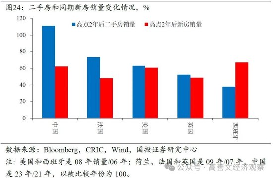 如下图24所示,比较泡沫破灭两年后与泡沫破灭前的销量,基本上所有国家新房和二手房销量均大幅回落。和这些国家相比,中国新房销量的回落幅度大体相当,但是中国二手房成交量反而小幅增加,新房和二手房销量出现如此剧烈的裂口是难以在需求层面寻找解释的。