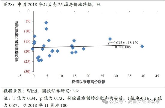 而类似典型泡沫破灭的场景在中国并不存在,如下图28所示,即使我们使用涨跌幅更大的贝壳25城数据,基本是二线城市。样本城市房价下跌的幅度和此前上涨的幅度无关,这和价格上涨在中国难以推动供应增加的讨论一致,这意味着过去一段时间的房价下跌是泡沫破灭的解释或难成立。