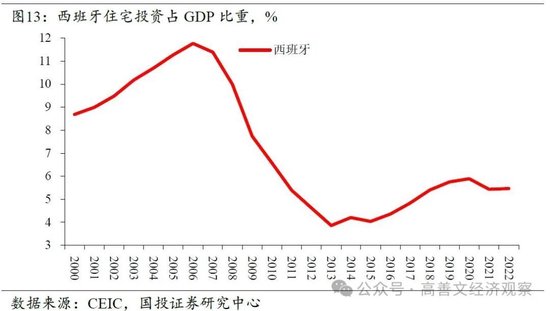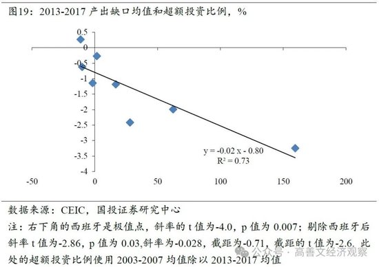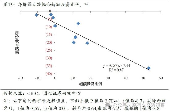 如下图15所示,纵轴是这些国家在2007年后最大的OECD名义房价跌幅,横轴是这些国家在2003-2007年地产投资占GDP比重的均值除以2000-2022年地产投资占GDP比重的均值得到的百分比,0代表着两个阶段房地产投资水平是相等的。这个百分比是泡沫期房地产超额投资幅度的代理变量(也可以理解为房地产投资的回落程度)。即使剔除西班牙之后,回归方程报告的斜率和截距变化不大。
