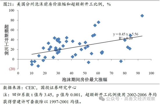 市场机制运行的一个自然结果是价格的上涨能导致供应的增加。如图21所示,尽管美国在2002-2006年期间整体房价和新开工出现较大幅度的上行,但分州的情况存在显著差异,由于不同州之间的土地和区划规则存在差异,使得供应对价格的响应存在差异。但是合并起来,统计显著的结果是价格的上涨显著驱动了供应的增加,符合理论上市场的运行机制。