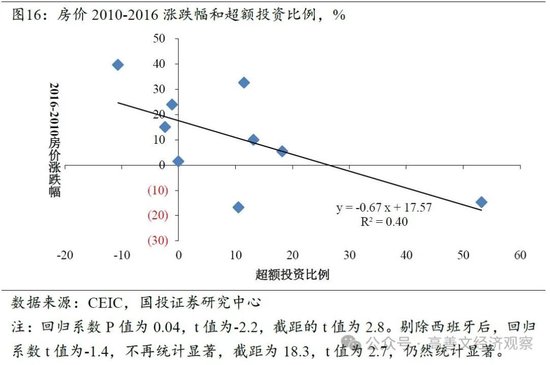 但在右侧,当欧洲国家普遍从金融危机中走出后,观察这些国家在2016年底和2010底年房价的变化,此前没有房地产超额投资的国家房价基本上显著反弹,此前存在超额投资的国家房价持平或者下跌居多。截距统计显著意味着房地产市场如果较为正常,其房价在事后反弹是统计显著的。