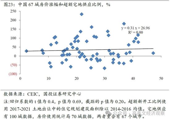 图22的结论是,中国房地产供应曲线是垂直的,即价格上涨无法推动供应的增加。这是因为中国的住宅土地市场全球范围内都是非常独特的,地方政府作为土地唯一的出让方,其供应土地并不遵循市场化原则,更多是受到财政纪律的约束。