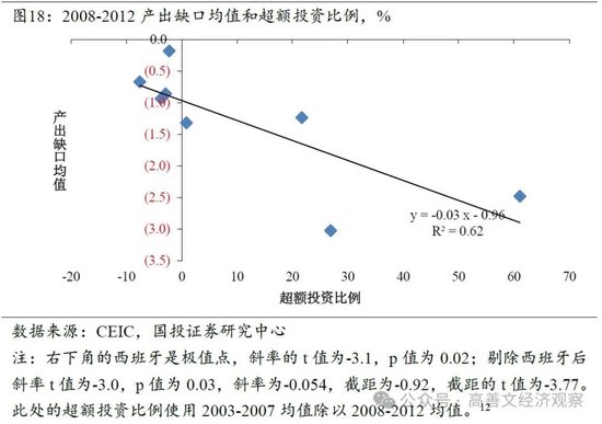 而观察经济增长,此前存在更多超额地产投资的国家在危机后五年(2008-2012)经济也显著更差。同时,回归方程的截距为-0.9,也是统计显著的,这意味着即使房地产市场此前处于非常正常的状态,在金融危机爆发后的五年内,经济产出显著下降。