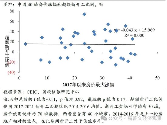 而观察中国的情况,则大相庭径。如下图22所示,如果认为2017-2021年之间积累了较多房价的涨幅,进而蕴含泡沫的风险,但是可以清晰的确认,在大中城市为主的样本中,房价上涨幅度和新开工之间没有关系,房价上涨无法推升供应的增加,这代表供应曲线是近似垂直的。