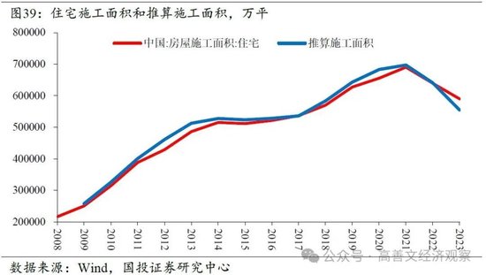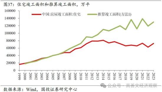 我们将方法2得到的竣工数据带回等式1,推算出无停工并且准时交付条件下的施工面积,和统计局直接报告的施工面积对比。如下图39所示,在2022年及之前,两者相对吻合的较好。而2022年后,停工和未能准时交付的情况较多,前者压低了实际值,后者压低了估算值,使得估计值和实际值差别也有限。