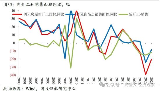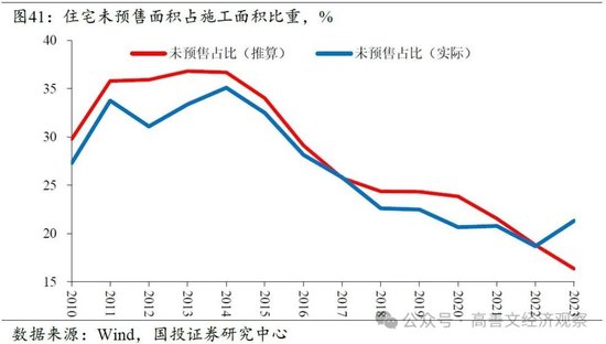 施工房屋面积其中包含了住宅和非住宅,住宅的施工面积要小得多,在50-60亿平量级。而庞大的在建面积由可以分为两个部分:完成预售的和待售的。而我们观察销售数据和新开工数据的增速,如下图35所示,在大部分时间,新开工面积的增速持平或者低于销售面积的增速。这意味着施工面积中可能大部分属于完成预售的商品房。
