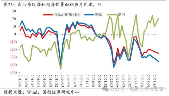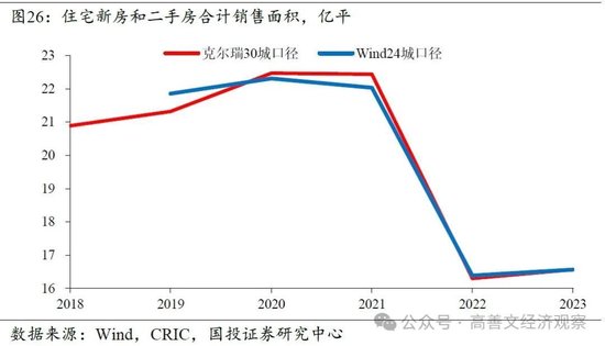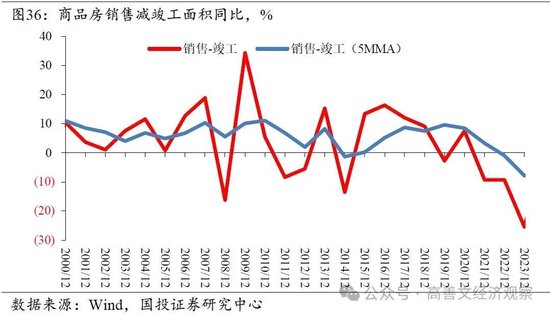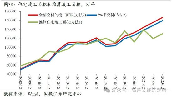 在2022年之前,我们用两种方法推算的竣工面积差别不大,中间的波动可能来自于已预售今年交付的面积这一项在不同年份的差异。这可能更接近真实竣工的情况。而2022年以来,竣工延期和保交楼工程的落地对两种计算方法的裂口是一个比较好的解释。