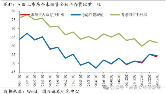 宏观的数据在微观层面上同样可以得到印证,观察A股上市房企财报中的存货和合同负债比例,如下图42所示。存货包含了在建工程和尚未开工的土地的价值,后者就是已经预售的房屋的价值。[18]观察这个比例,同样可以发现企业部门尚未售出的存货占比存货总体比重在2014年以来持续下降,即使考虑存货减值的影响,结论没有太大变化。2022年以来的上升可能反应了新开工面积减少和销售毛利率下降的共同影响。
