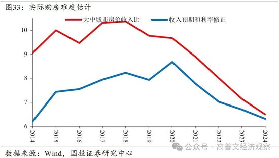 相比于疫情前的2019年,收入增长预期从8%下降到4%,但是同时房贷利率也下降2%,抵消了一半的负面影响。即使是这样一个偏悲观的假设下,如果认为购房资金的平均久期是8年,使用收入增速预期减去房贷利率,将其作为贴现率,结合静态的房价收入比去估计实际的购房难度。这个估计值计入了对未来收入的悲观预期和房贷利率的变化,较好地衡量了购房难度。但即使在偏悲观的假设下,当下的购房难度也较几年前大幅下降。