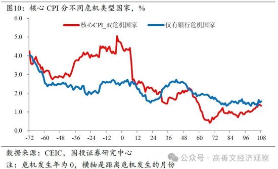 而观察失业率,两组国家都受到长时间的高失业,双危机的国家损失更大。但是存在房地产泡沫的国家在危机之前失业率有一个明显的下降,显示房地产旺盛的投资可能显著抬升了内需,将经济推升至过热的状态。